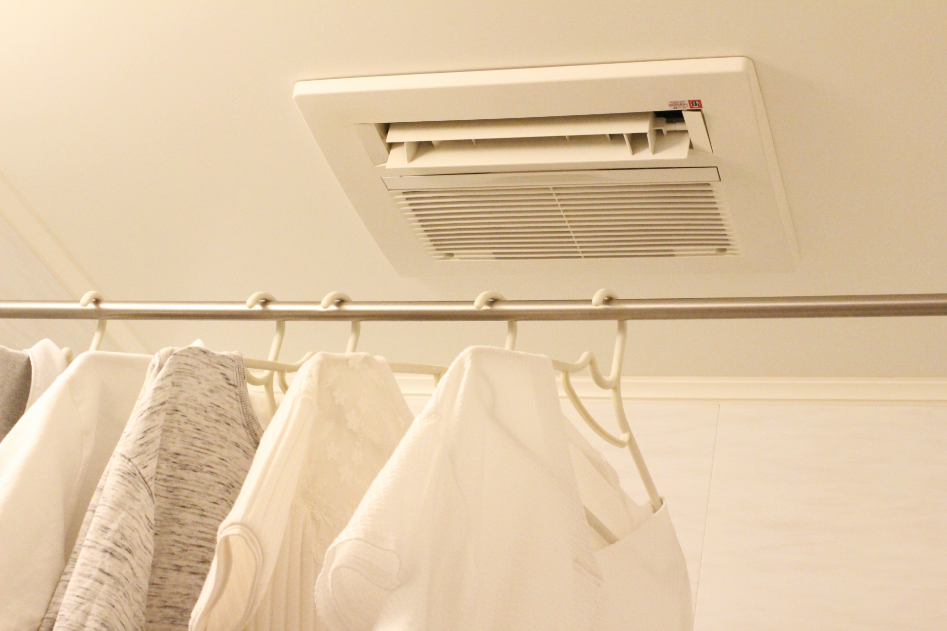 浴室乾燥機とは、浴室内に設置された乾燥機のことで、さまざまなタイプがあるものの、天井に取り付けられているのが基本です。衣類をハンガーにかけ、浴室内に設置した突っ張り棒に吊るしてスイッチをONにします。